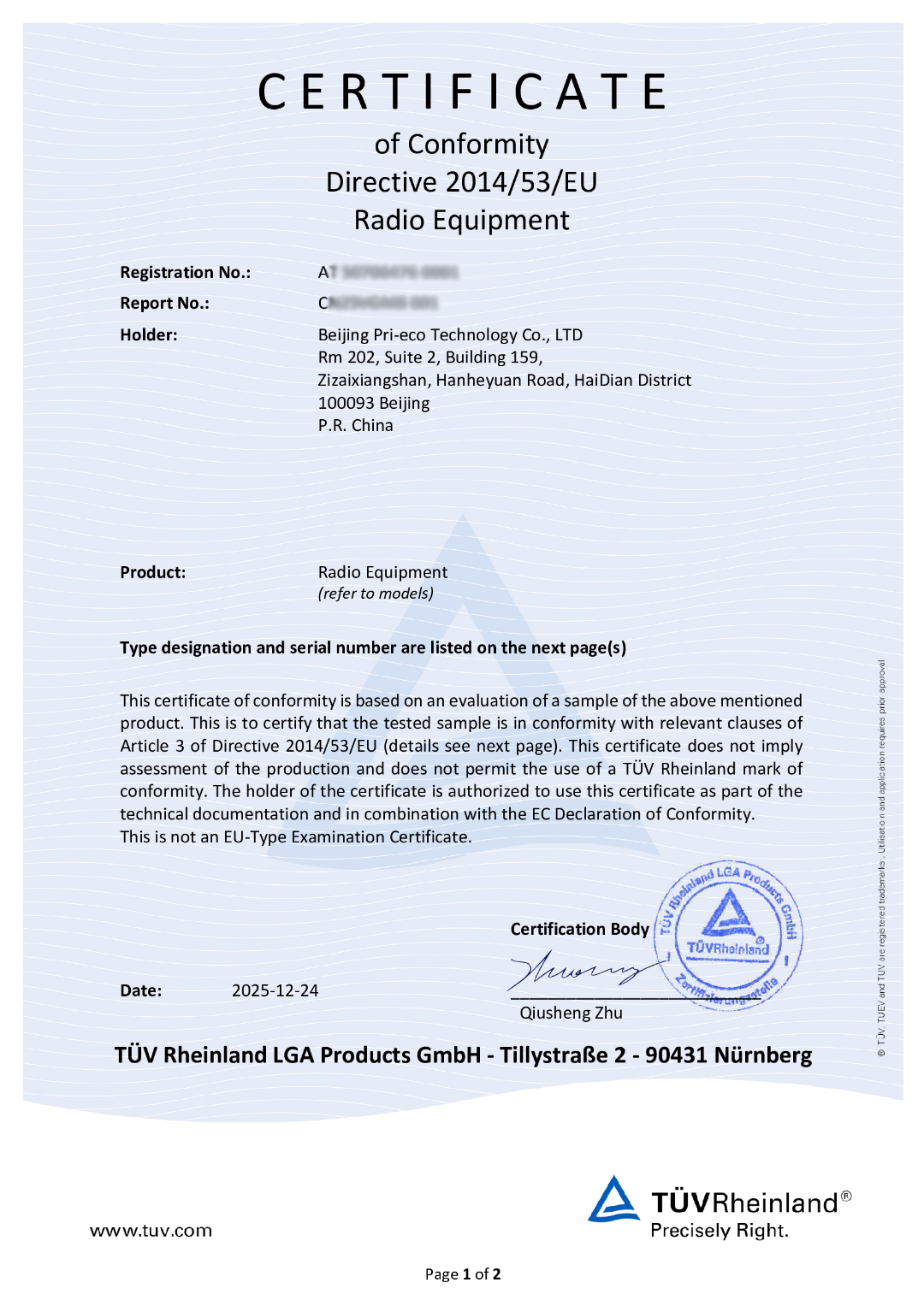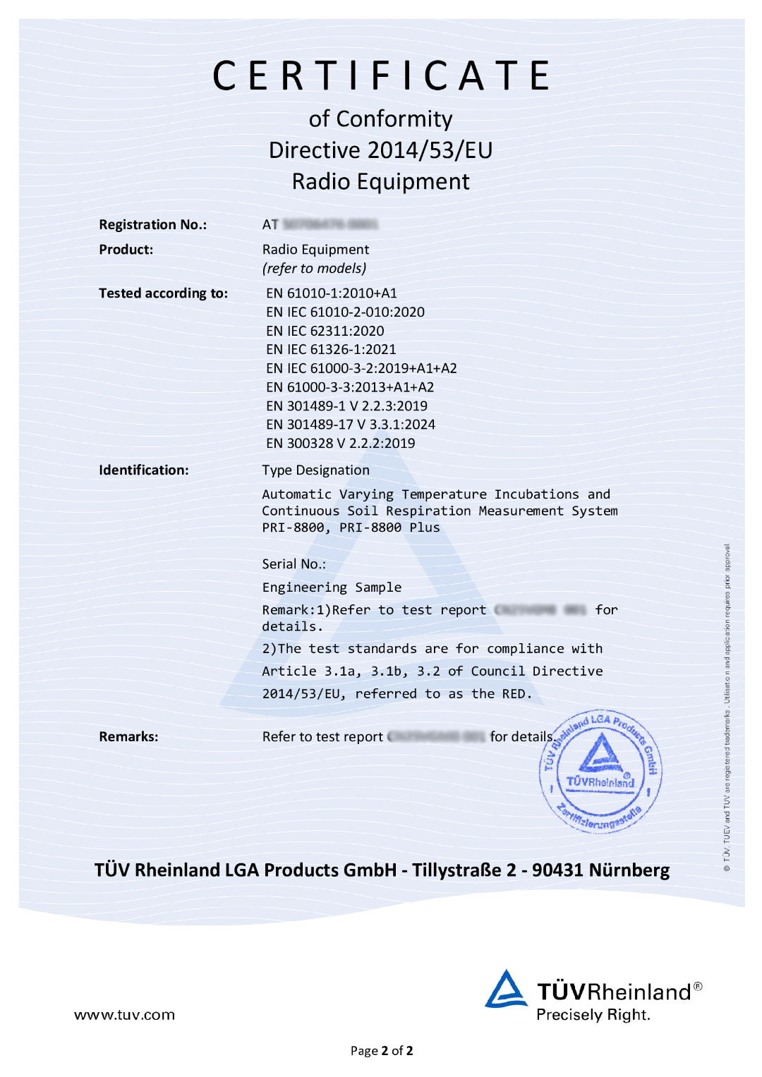 PRI-8800及PRI-8800 Plus已成功取得由TÜV Rheinland(莱茵)颁发的欧盟CE认证(CERTIFICATE of Conformity Directive 2014/53/EU Radio Equipment)。这证明设备在安全性、电磁兼容性以及无线电性能方面均达到了国际领先水平,具备进军全球市场的“通行证”。